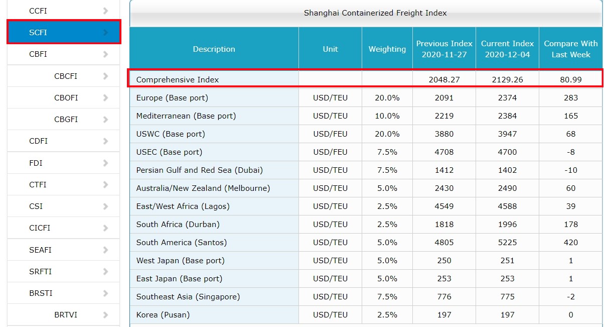 이 컨테이너 운임지수가 12월4일 기준으로 2129.26 포인트를 나타내며 집계를 시작한 이후 최대치를 보이고 있다.