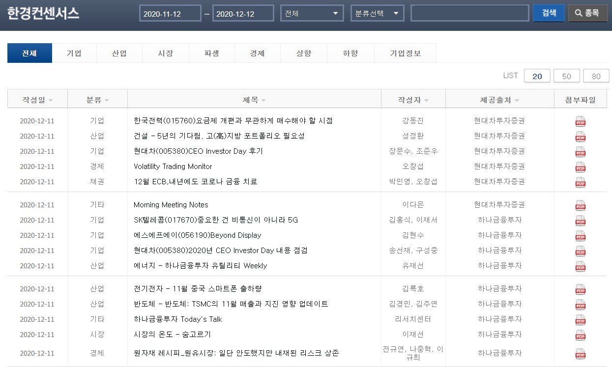 리포트가 항상 정확한 것은 아니지만 그래도 하나의 참고자료로 삼기에는 나쁘지 않은 자료라고 생각해 리포트를 모아둔 사이트를 하나 소개하려고 한다. 바로 한경 컨센서스가 그것이다. 링크를 걸어두니 필요한 분들은 들어가 볼 것을 권한다.