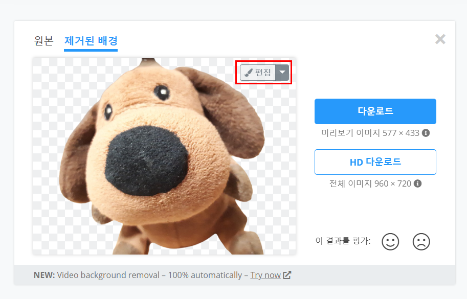 여러 차례 시도해본 결과 인물사진은 완벽하게 배경이 제거되는 것을 확인했지만 아래에서 보는 것처럼 멍멍이 사진은 약간 수정이 필요하게 나왔다. 그래도 당황하지 말고 [편집] 버튼을 눌러준다.
