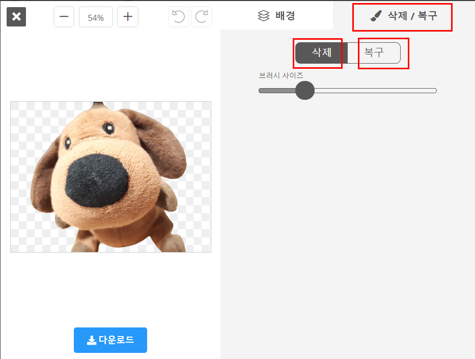 [편집] 버튼을 눌러주면 아래처럼 삭제와 복구 버튼이 나오고 브러시 크기를 조절할 수 있게 옵션이 등장한다. 적절하게 머리 윗부분을 제거해주고 다리를 추가해준다.
