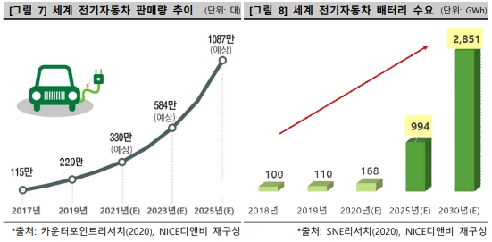 SNE리서치에 따르면, 세계 전기자동차 2차전지 배터리의 수요는 2018년 100GWh에서 2020년 약 170GWh로 증가하였으며, 2030년 2,851GWh로 급성장할 것으로 전망된다.