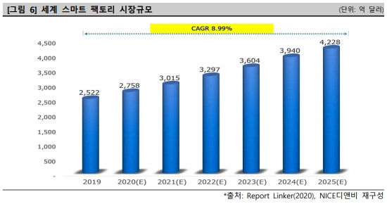 시장분석기관 리포트링커(Report Linker)의 2020년 시장보고서에 따르면 스마트 팩토리의 세계 시장규모는 2019년 2522억 달러를 기록했으며, 연평균 8.99% 성장하여 2025년 4228억 달러의 시장규모를 형성할 것으로 전망된다.
