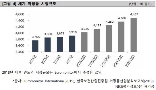 글로벌 시장조사기관 유로모니터 인터내셔널의 자료에 따르면 2017년 세계 화장품 시장규모는 전년 대비 1.1% 증가한 3918억 달러를 기록하였다.