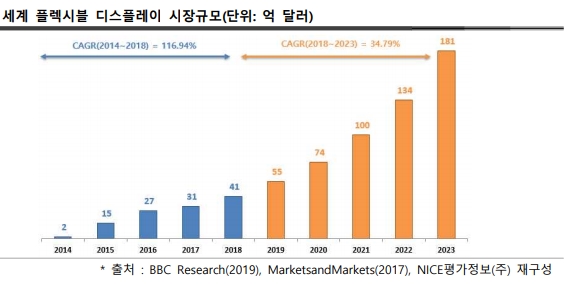 세계 플렉시블 디스플레이 시장은 2014년 2억 달러에서 2018년 41억 달러 규모로 성장하였으며 2018년 이후 연평균 34.79% 성장하여 2023년에는 181억 달러의 시장규모를 형성할 것으로 전망된다.