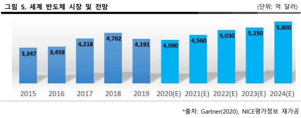 세계 반도체 시장의 경우 시장조사업체 가트너에 따르면 2018년부터 급락했던 메모리 시장이 2020년 이후 정보기술 (IT)과 5G 분야 수요가 증가하면서, 칩 판매와 제조 설비 투자가 함께 늘어날 것으로 전망되고 있다.