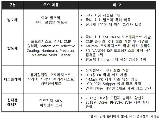 반도체 분야의 주요 제품으로 포토레지스트, CMP 슬러리 등이 있고, 디스플레이 분야로는 유기절연막, 포토레지스트, 박리액, 식각액 등이 있다.