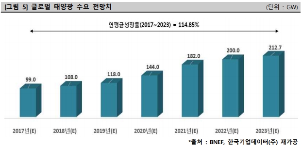 한국수출입은행 신재생에너지 산업 동향 보고서(2021년 2분기)에 따르면, 2021년 글로벌 태양광 수요는 코로나19 상황 안정, 기후변화 및 ESG 이슈의 본격적인 등장으로 180.0GW를 넘을 것으로 예상되며, 2022년에는 200GW 시대가 열릴 것으로 전망하고 있다.