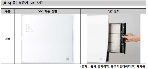 공기살균기 ‘VK’는 독자적인 광촉매 기술을 통해 세균뿐만 아니라 냄새의 원인이나 바이러스 등의 유해 물질도 제거할 수 있고 반응효율이 높은 촉매를 사용하여 필터 표면에 더 빨리 오염 물질을 접촉시키는 풍향 설계로 광촉매 반응 능력을 극대화함으로써 1분에 1200mL를 살균하는 탁월한 성능을 가지고 있다.