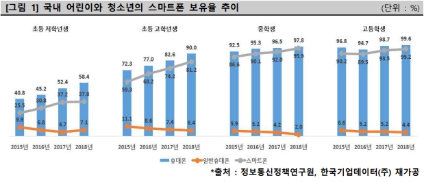 정보통신정책연구원 2019년 어린이와 청소년의 휴대폰 보유 및 이용행태 분석에 따르면, 어린이와 청소년의 휴대폰 보유율은 지속적으로 증가하여 2018년 기준 초등 저학년생을 제외한 초등 고학년생, 중학생, 고등학생 모두 90% 이상의 보유율을 보이고 있다.
