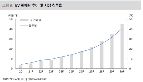 기존 2030년 미국 완성차 시장의 신차 기준 전기차 비중은 40% 미만의 예상이 많았으나 이를 웃도는 목표로 중장기 성장속도는 더욱 가파르게 진행될 수 있다는 전망이 나온다.