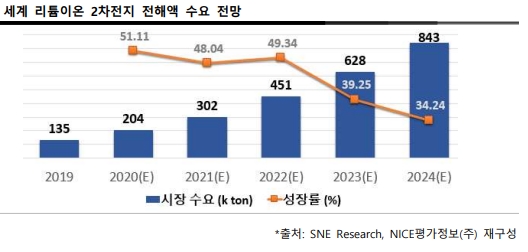 에너지산업 관련 시장조사업체인 SNE 리서치에 따르면, 2019년 세계 리튬이온 2차전지 전해액 수요는 총 13만5천 톤에 달했으며, 이후 성장세를 지속하여 2024년에는 약 84만3천 톤까지 늘어날 것으로 전망했다.