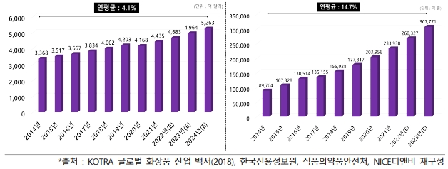 대한무역투자진흥공사(KOTRA) 자료에 따르면 화장품 세계시장은 연평균 4.1%로 성장하여 2024년에 5,263억 달러의 규모를 형성할 것으로 전망된다.