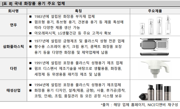 국내 주요 화장품 용기 제조업체 2020년도 매출액 현황을 살펴보면, 매출액은 총 8,096억 원이며 연우(30.34%), 펌텍코리아(24.11%), 삼화 플라스틱(11.14%), 다린(7.84%), 태성산업 (6.77%) 순으로 시장을 점유하고 있다.