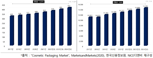시장조사기관 마켓앤마켓의 자료에 따르면 화장품용 플라스틱 용기 세계 시장규모는 2017년 320억 달러에서 2019년 337억 달러로 성장하였으며, 이후 연평균 3.21%로 성장하여 2024년에는 412억 달러 수준의 규모를 형성할 것으로 전망된다.