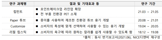 또한 화장품 용기 시장에서 가장 많은 비중을 차지하는 튜브 제품을 종이소재를 활용하여 제작해 플라스틱 사용량을 약 58% 저감하였다.
