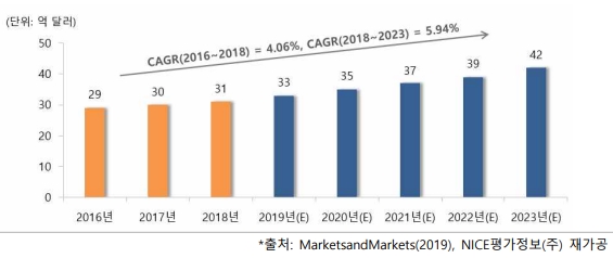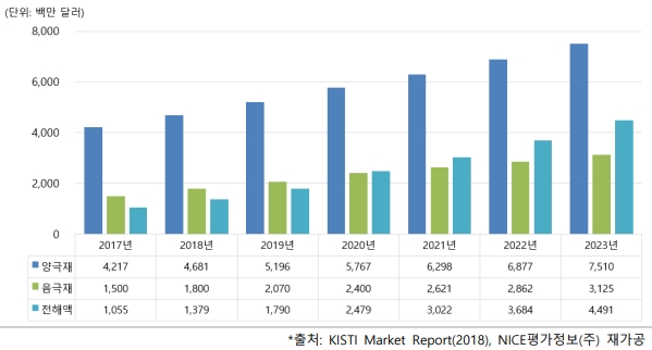 한국과학기술정보연구원(KISTI)에 따르면, 세계 이차전지용 양극재 시장은 2017년 약 4217백만 달러 규모의 시장을 형성하였고, 연평균 10.1% 성장하여 2023년 7510백만 달러의 규모를 형성할 것으로 예상된다.