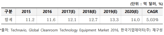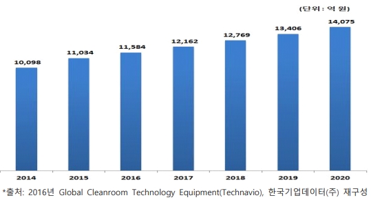 글로벌 시장기관 테크나비오의 보고서에 따르면 국내 클린룸 시장은 2013년 1조 98억 원에 서 2014년 1조509억 원으로 4.07% 성장하였고, 2016년 1조 1,584억 원 규모가 예상되며 지속적인 성장을 통해 2020년 1조 4,075억 원의 시장규모를 보일 것으로 전망된다.