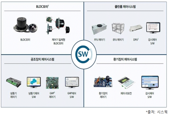시스웍(269620)은 FFU(Fan Filter Unit), EFU(Equipment Fan Filter Unit)의 구동, 제어, 감시, 모니터링 등 통합 환경 감시제어 시스템과 BLDC 모터 등을 개발, 공급하는 기업이다.