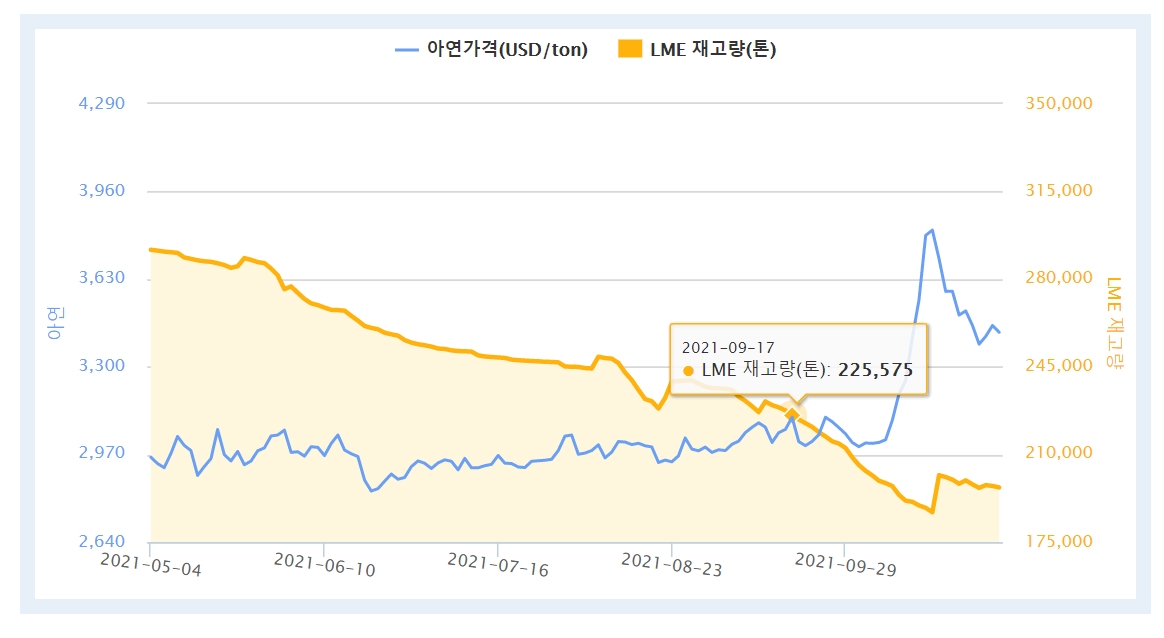 글로벌 아연가격은 2021년 9월1일 기준 톤당 2977.5달러에서 2021년 10월18일 톤당 3815달러까지 올랐으며 2021년 11월1일 기준 톤당 3430달러로 높은 수준을 유지하고 있습니다.