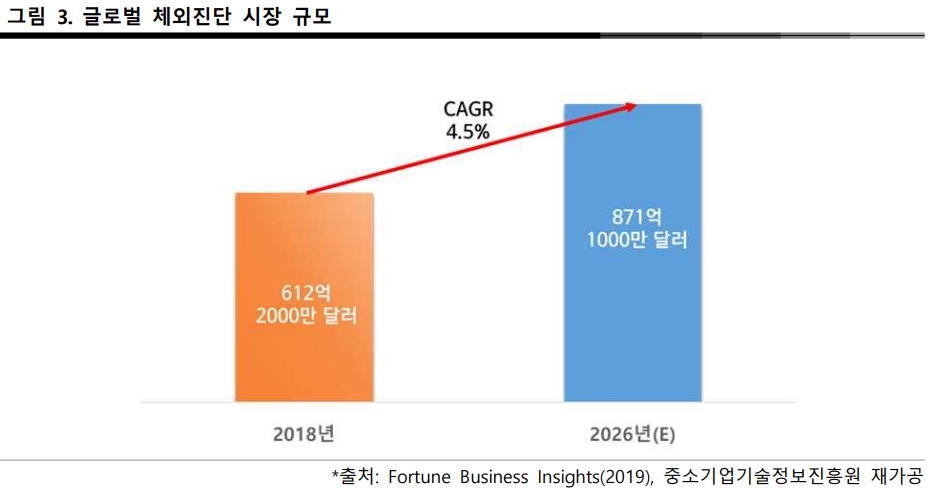 포춘비즈니스 인사이트(Fortune Business Insights)의 2019년 보고서에 따르면 글로벌 체외진단 시장은 2018년 612억2천만 달러에서 연평균 4.5%씩 성장하여 2026년에는 871억1천만 달러의 시장을 형성할 것으로 전망하고 있다.