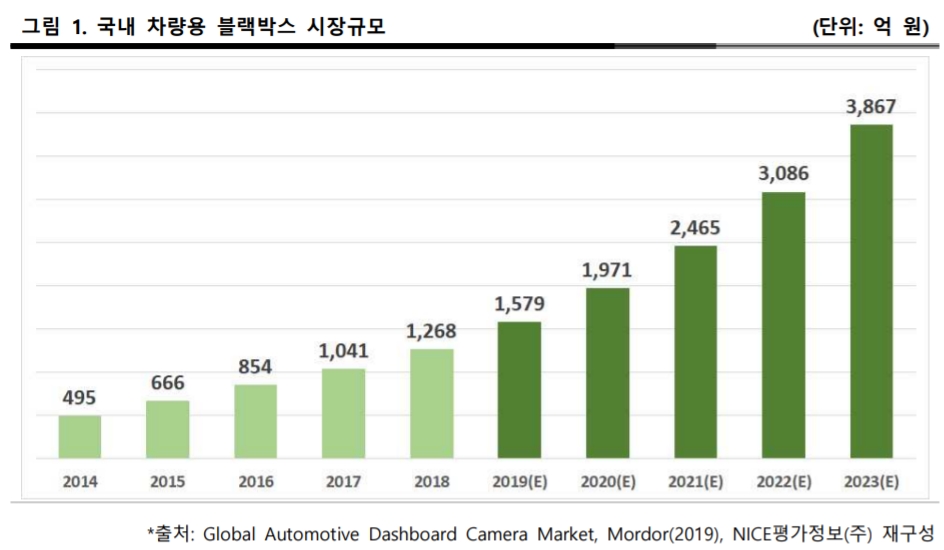 Global Automotive Dashboard Camera Market(2019)에 따르면 국내 차량용 블랙박스 시장규모는 2014년 495억 원에서 2018년 1,268억 원으로 연평균 26.5% 성장하였으며 시장 환경 및 업황, 기술 성장 수준을 고려할 때, 2023년 3,867억 원의 규모로 성장할 것으로 전망된다.