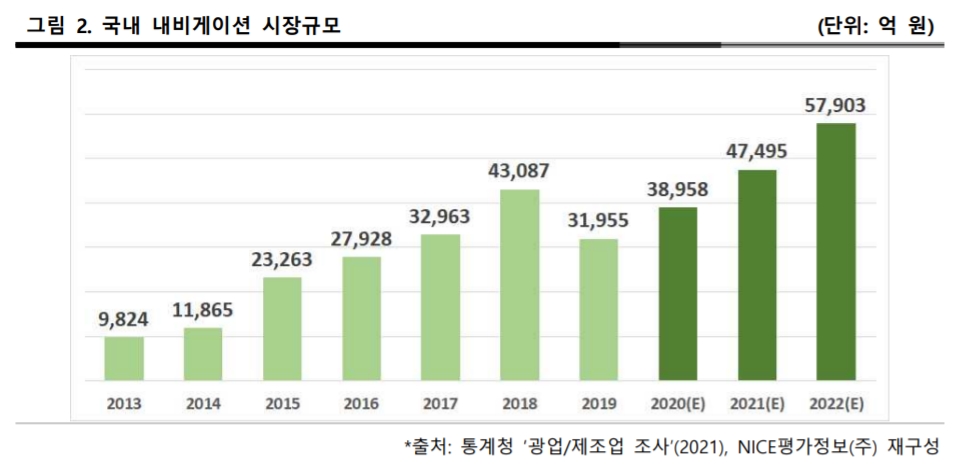 통계청의 광업제조업조사(2021)에 따르면 국내 내비게이션 시장규모는 2014년 1조 1,865억 원 규모에서 연평균 21.91% 증가하여 2019년 3조1,955억 원 규모에 달한 것으로 나타났으며 시장 환경, 업황 등을 고려할 때, 2022년에는 5조7,903억 원 규모로 성장할 것으로 전망된다.