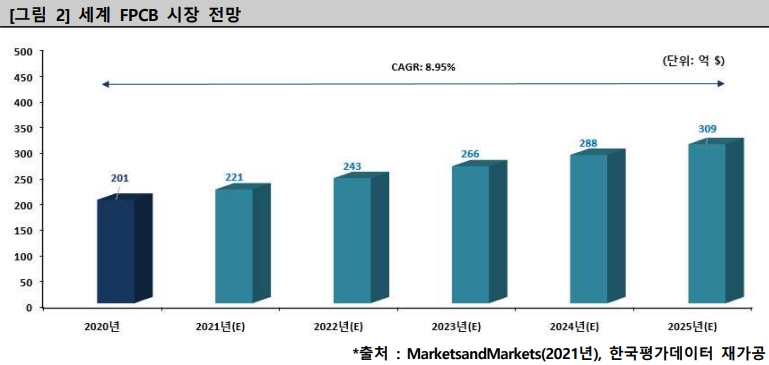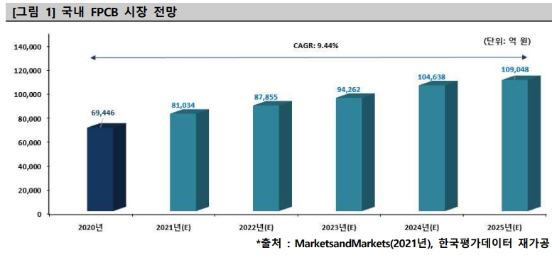 시장조사기관 마켓앤마켓에 따르면 국내 FPCB 시장은 2017년 5조594억 원에서 연평균 11.13% 증가하여 2020년 6조9446억 원 규모이며, 2020년 이후 연평균 9.44% 성장하여 2025년에는 10조9048억 원의 시장규모를 형성할 것으로 전망된다.