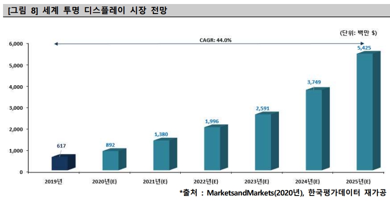 시장조사기관 마켓앤마켓의 자료에 따르면 2019년 세계 투명 디스플레이 시장규모는 617백만 달러이며, 연평균 44%씩 증가하여 2025년 5425백만 달러에 달할 것으로 전망된다.