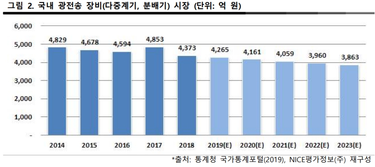 통계청의 국가통계포털 광업,제조업조사(품목편) 자료에 따르면, 국내 광전송 장비(다중계기, 분배기) 출하금액은 2014년 4829억 원에서 2018년 4,373억 원으로 연평균(CAGR) 2.45% 감소하였다. 같은 CAGR을 적용 시 2023년에는 3863억 원의 시장을 형성할 것으로 전망되고 있다.