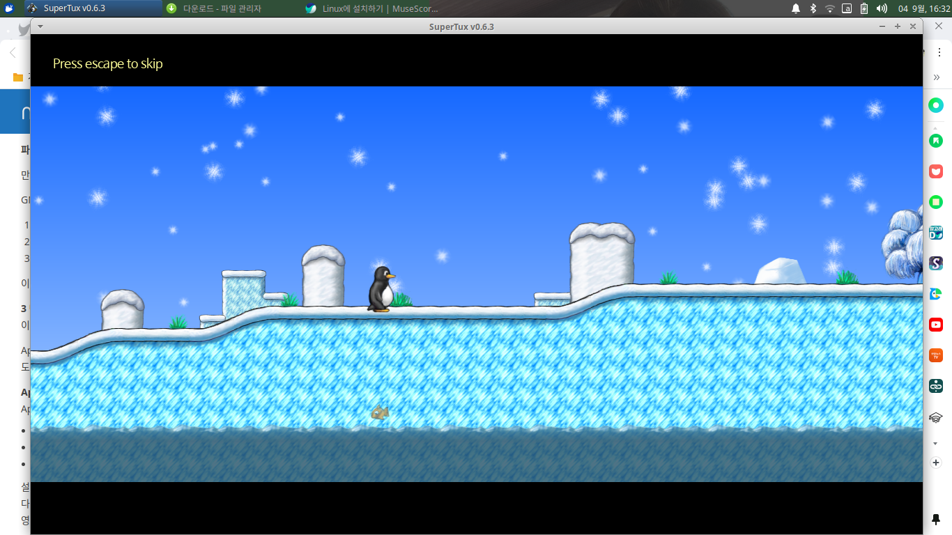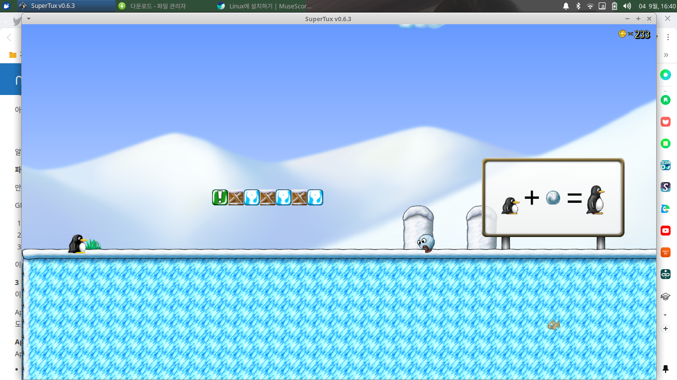 슈퍼마리오의 리눅스 버전이라고 할까요..? ㅎㅎ 리눅스의 상징인 팽귄, Tux가 마리오처럼 모험을 떠나는 게임을 해보았습니다.